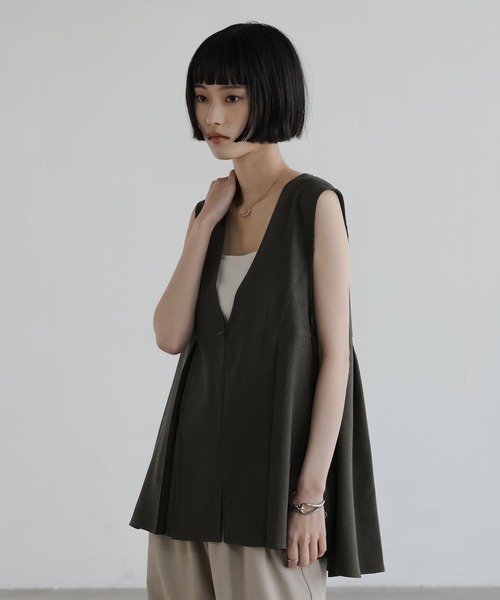 ■素材■ 強い撚りをかけた糸で織り上げた生地に特殊加工を施して、雰囲気のある生地感を表現。 軽やかで通気性も高く、ドライタッチな風合いで暑い時期もさらりとした履き心地に。 洗濯してもシワになりにくく、取り扱いも簡単です。 ■デザイン■ ウエストで切りかえているペプラムデザインのジレになります。 ボリュームが出すぎないようにタックを調整しているので、ZIPを閉じても開けても綺麗に着用いただけます。 ■スタイリング■ 同素材のアイテムとのセットアップでの着用がオススメです。 ブラウスやカットソーの上に重ねるだけで、きれいめなスタイリングに。 デニムやカジュアルなアイテムと合わせることで、抜け感のある大人のカジュアルスタイルが完成します。