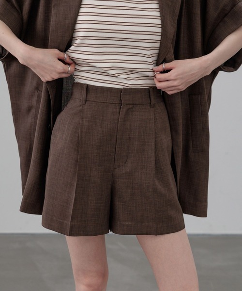 ■素材■ ポリエステルで麻のような雰囲気を表現したリネンライクファブリック。 ざっくりとしたドビー組織でドライタッチな風合いが特徴的で これからの時期にピッタリです。 ■デザイン■ シンプルですっきりとしたシルエットが特徴の、ショートパンツです。 ウエストにタックが入っているので、裾にかけて程よいゆとりができ、スタイルアップ効果が期待できます。 後ウエスト部分はゴム仕様で、快適に履いていただけます。 ■スタイリング■ 同素材のアイテムとのセットアップでのスタイリングがおすすめです。 ベーシックなアイテムなので、その日の気分に合わせて様々なアイテムとスタイリングが可能です。 ニットや裏毛などカジュアルなトップスとの相性も◎。