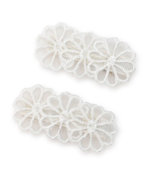 レースにフラワーの刺しゅうを添えたヘアクリップです。単色でまとめつつ、透け感のある素材で程よくメリハリをつけているのがポイント。大きめサイズなので、前髪を留めて主張させるのもポニーテールなどのサイドの飾りにするのもおすすめです。アレンジを楽しめるように、2個セットでお届けします。