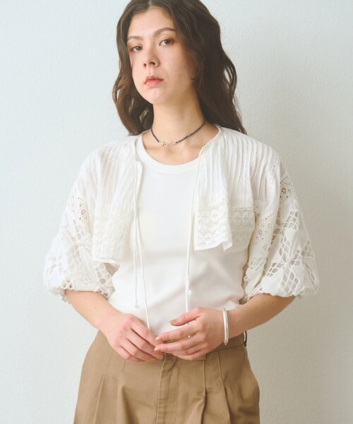 【2026SS】 コーディネートに奥行きと抜け感をプラスするレースボレロ ■異なる表情のレースを組み合わせた存在感のあるボレロ。 ■立体感のあるスリーブデザインが、羽織るだけでスタイリングに華やぎを添える一枚。 ■前後身頃部分には一点一点手作業でタックの縫製を行い、凹凸感のある仕上がりに。 ■スリーブ部分には生地の上から大柄の機械刺繍を施し、部分的に生地をカットすることで立体感のあるスカシのレース柄を表現。 ■甘くなりすぎないバランスで、カジュアルなアイテムとのミックススタイルもおすすめ。 【COLOR】 オフホワイト:清涼感をプラスするナチュラルなオフホワイト。 ブラック:ナチュラルさとモードな雰囲気を備えたブラック。 【MATERIAL】 薄手で丈夫なインド綿を使用した、清涼感のあるさらっとした着心地の生地。 ---------------------------------------------------- 洗濯方法:手洗い可 透け感:あり 裏地:なし 伸縮性:なし 光沢感:なし ---------------------------------------------------- 【注意事項】 ・画像の商品はサンプルです。実際の商品と仕様、加工が若干異なる場合があります。 また 、パソコンやスマートフォンのモニター環境などにより、色味が違って見える場合があります。 ・店頭及び屋外での撮影画像は、光の当たり具合で色味が違って見える場合があります。 商品の色味は、スタジオ撮影の画像をご参照ください。 ・入荷状況により、お届け予定が前後する場合があります。 ・お客様への発送が店頭販売より遅れる場合があります。 ・追加生産商品は、一部の店舗、通販で販売中の場合があります。 予めご了承下さい。 【気になるアイテムは、「お気に入り」登録を】 ハートマークをクリックしておくことで、スムーズにお買い物が楽しめます。 ・ラスト一点のお知らせ ・再入荷のお知らせ ・SALEのご案内