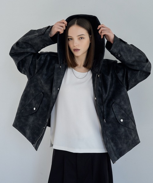 ELLUV 2026Spring/Summer 上質なPUレザー素材とメタルパーツが彩るモードなディテールが高級感あふれるフーディーブルゾン。 -Design- 上質な存在感を纏う、ハイクラスなPUレザーを使用したオーバーフードブルゾン。 フロントは比翼仕様にすることでミニマルかつ洗練された印象に仕上げると同時に、防風性も高めた実用性のある設計。要所にはメタルパーツを採用し、モードなアクセントと高級感をプラスしています。大胆なワイドアームが存在感を際立たせ、袖口のアジャスト仕様によりシルエット変化も楽しめます。 色はシンプルながら素材の良さが引き立つブラックとヴィンテージ感あふれる加工感が雰囲気を増すヴィンテージブラック。 羽織るだけでスタイリングを格上げする、主役級アウターです。 -silhouette- 身幅にゆとりを持たせたリラックス感のあるサイジングに、ELLUVらしいショート丈シルエットを掛け合わせることで、トレンド感とスタイルバランスを両立。 -Fabric- 生地にこだわり、アウターとして使えるPUレザーを選定。 肉厚でしっかりとした質感が生み出す重厚感と、リアルレザーのような自然なシボ感により、ラグジュアリーな雰囲気を演出します。 ※Attention※ ※撮影場所やライティング、お使いのモニター環境によって色の見え方が異なる場合がございます。 ◆ELLUV/エルヴ◆ 唯一無二のデザイン性/一切妥協しない高品質への追求。