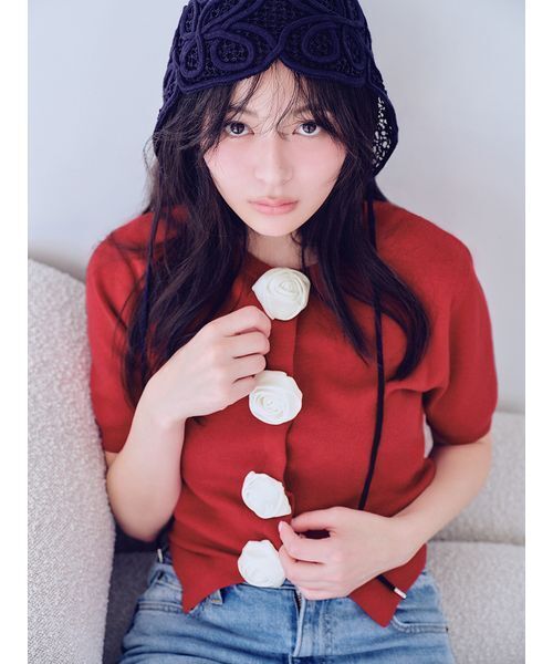 【サテンローズが目を惹く、1枚で決まるカーディガン】【Design/Styling】フロントに施した大きなサテンローズが印象的な主役級カーディガン。スナップ仕様で着脱しやすく、前を開けた着用もおすすめ。自然なブラウジングが叶うトレンドライクなシルエットです。【Fabric】程よく肉感のあるニット素材を使用。立体的なモチーフが映える素材感に仕上げました。グレー、レッド、サックス、ネイビーの4色展開。レッドのみアイボリー、その他ホワイトのローズモチーフです。透け感:なし裏地:なし伸縮性:あり光沢感:ややあり生地の厚さ:普通※照明の関係により、実際よりも色味が違って見える場合があります。またパソコン・スマートフォンなどの環境により、若干製品と画像のカラーが異なる場合もございます。予めご了承ください。商品の色味は、商品単品画像をご参照下さい。 ※商品画像はサンプルのため、色味やサイズ等の仕様に変更がある場合がございますので、予めご了承ください。