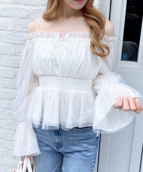 オフショルダー&チュールで軽やかに着こなせるブラウス。 ふんわりとしたボリューミーなシルエットもバスト下のシャーリングでメリハリをプラス。 華奢なショルダーストラップは取り外しも可能です。 胸元と袖口にはリボンをあしらってキュートなアクセントに。 大人っぽく合わせられるキレイカラーが揃っています。透け感のある素材も同系色の裏地付きで安心。 ・肩紐調整可 ・肩紐取り外し可 【以下ブルーグレー参考。カラーにより多少の誤差あり】 ・透け感:透ける(表地) ・伸縮性:なし ・生地の厚さ:薄め ・裏地:あり