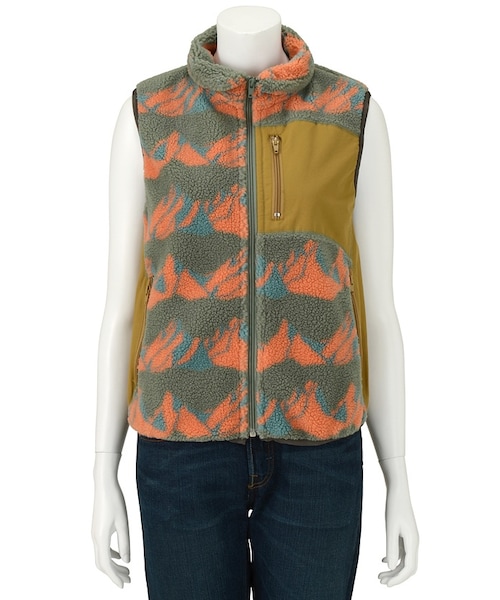 オリジナルの山脈柄のボアとシャリ感のある生地のコンビネーションがポイントのベスト。ファスナーガードがついており、厚みのあるボアが挟み込まないようになっていたり、メッシュ素材の裏地を使用してムレにくい仕様にしてりと、本格的なアウトドア仕様になっています。Torso:H163.5 B80 W58.5 H86 着用サイズ:02サイズ