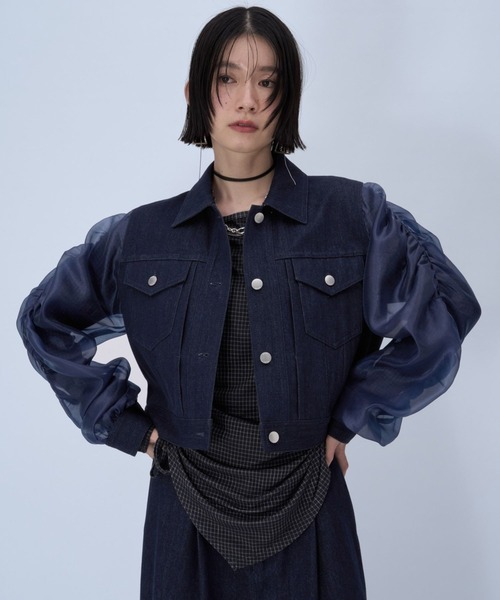ーーー シアーの切り替えデザインが目を惹く デニムジャケット ーーー point □デニムとシアーの異素材デザインがポイントのデニムブルゾン □程良い肌見せで、抜け感とモードな雰囲気をプラス □ベースに薄手のデニム生地、袖は透け感の強いオーガンジーを使用し夏まで使いやすい □袖は女性らしいギャザーデザインを施し、二の腕のラインが見えづらく素肌にも羽織りやすい styling 骨格ナチュラル:デニムパンツを合わせ、セットアップで着用するのがおすすめ。スニーカーや厚底のシューズでカジュアルにまとめたスタイリングがピッタリ。 骨格ウェーブ:タイトめのニットやカットにミニ丈のボトムスを合わせ、今年らしい印象に。レースやチュールなど女性らしいアイテムをプラスすると◎ 骨格ストレート:シャツやブラウスにタイトなスカートを選び、デニムのカジュアルさと綺麗めアイテムをミックスしたスタイリングがおすすめ。 set item セットアップで着用可能な同素材のアイテムご用意あり。 セットアップ対応のパンツはコチラを検索→【645228】 ※加工を施した画像を使用しております。 実物と色味が異なる可能性があるため、色味は詳細後ろにある生地寄り画像を参考にお願いいたします。 あらかじめご了承下さい。