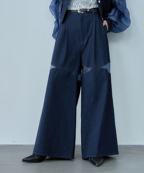 ーーー シアーの切り替えデザインが目を惹く モードな大人デニムパンツ ーーー point □デニムとシアーの異素材デザインがポイントのデニムパンツ □程良い肌見せで、抜け感とモードな雰囲気をプラス □ハイウエストで着用可能で今年らしいシルエットに作成 □フロントにはタックが入っており、腰回りはすっきりと見せ脚長効果に◎ styling 骨格ナチュラル:ゆったりとしたニットやスウェット、Tシャツを合わせ、全体的にリラックス感のあるスタイリングがピッタリ。 骨格ウェーブ:ハイウエストデザインの為、ショート丈のトップスやアウターを合わせるのがおすすめ。更にスタイルアップ効果に◎ 骨格ストレート:シャツやブラウスを合わせ、カジュアルと綺麗めをミックスしたスタイリングに。パンプスなど綺麗めなシューズでまとめスタイリッシュな印象。 set item セットアップで着用可能な同素材のアイテムご用意あり。 セットアップ対応のブルゾンはコチラを検索→【645223】 ※加工を施した画像を使用しております。 実物と色味が異なる可能性があるため、色味は詳細後ろにある生地寄り画像を参考にお願いいたします。 あらかじめご了承下さい。
