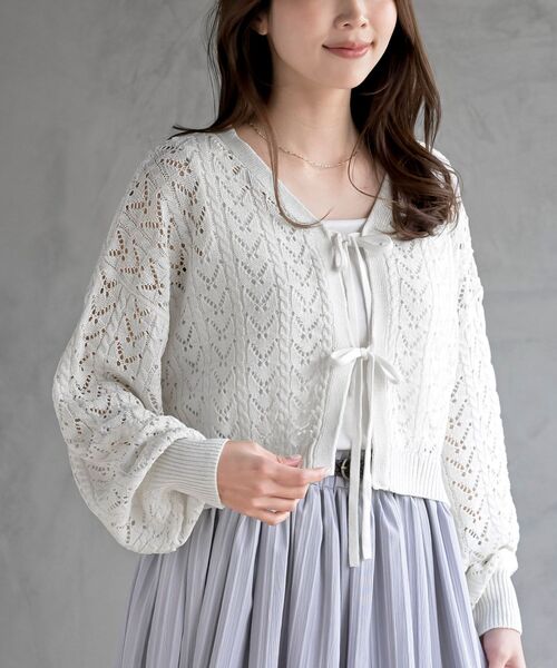 ☆2026/SS NEW☆ フェミニンリボンのボレロカーデ 上品でさわやかな透かし編みのショートカーディガン。 ほどよくボリューミーな袖が女性らしい装いを演出します。 ワイドなシルエットに短めの丈がバランスの良いコーデに。 フロントリボンがフェミニンなアクセントになっています。 きちんと感のあるオンオフ使えるアイテム。 裏地なし 伸縮性なし 薄手 前開きリボン結び 編み加減や染めの具合でデザインやサイズ等異なる場合もございます 洗濯:手洗い可 ▼お気に入り登録でお得がいっぱい▼ ~商品をお気に入り登録~ 再入荷・ラスト1点などの通知を受け取ることができます! ~ブランドをお気に入り登録~ 《rps》の新商品・再入荷情報をいち早くお届け!