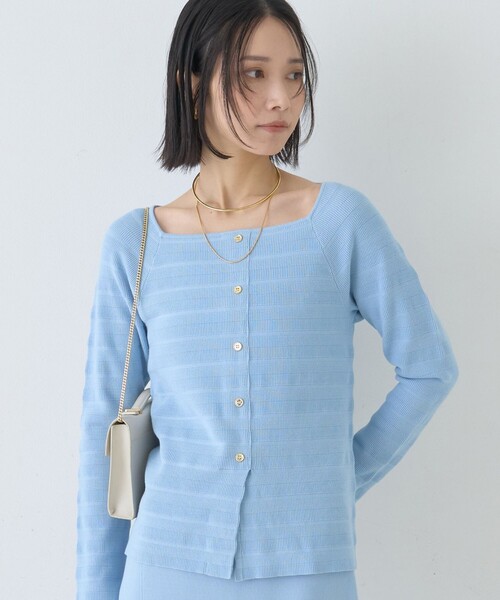スクエアネックの上品な肌見せ春ニット ストレッチ性に優れたビスコース混素材で仕立てた、スクエアネックのボーダー柄ニット。 プルオーバーはボーダー調の編み組織で表情豊かに仕上げ、 カーディガンは前開き仕様で着こなしに幅を持たせています。 スクエアネックは程よい肌見せで上品かつ女性らしい印象を与え、 フロントに並んだボタンがアクセントに。 素材のしなやかな伸びときれいな落ち感により、 セットアップのスカート(31520347000)と揃えれば統一感のあるモダンな装いに。 デイリーのカジュアルからきれいめオフィススタイルまで幅広く活躍する万能ニットです。 セットアップで統一感:同素材のスカート(31520347000)やパンツと合わせてワントーン・セットアップで洗練された印象に。 カジュアルダウン:デニム+スニーカーで肩の力の抜けたデイリースタイルに。 きれいめ:タックパンツ+パンプスでオフィスカジュアルに最適。スクエアネックを活かしてネックレスで華やかさをプラス。 【注意事項】 ※商品画像は、光の当たり具合やパソコンなどの閲覧環境により、実際の色味と異なって見える場合がございます。あらかじめご了承ください。 ※画像の商品はサンプルです。実際の商品と仕様、加工が若干異なる場合があります。 ※サイズ表記はあくまで目安となります。 ※その他の予約商品、通常商品との同時決済はできません。 ※入荷状況により、お届け予定が前後する場合があります。 ※お客様への発送が店頭販売より遅れる場合もあります。 ※追加生産商品は、一部の店舗、通販で販売中の場合がございます。予めご了承下さい。 ※商品を使用前に、タグ等に記載されている「取り扱い上の注意書き」「洗濯表示」を必ずご確認ください。 ※商品に不良が無い場合、包装紙および箱の彼損がございましても発送いたします。あらかじめご了承ください。