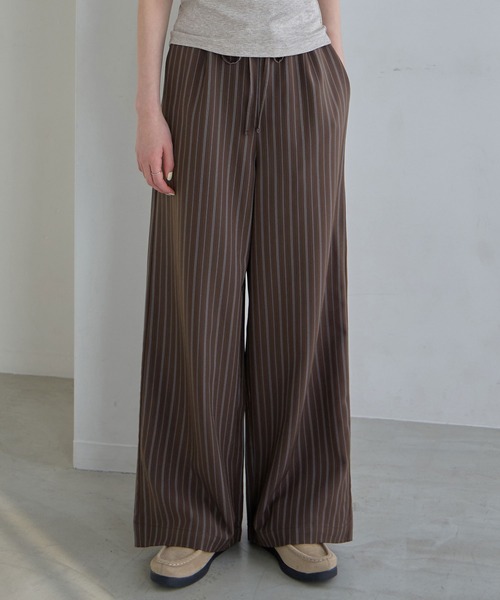 【CHAN ME/26SS】 - ラフだけどおしゃれみえ!トレンドライクなストライプパンツ - [DESIGN] フロントタックが入ったトレンドライクなストライプパンツ。 控えめなストライプ柄が繊細で、おしゃれなこなれた雰囲気を作ってくれます。 また刺繡見えのストライプ柄のため、高級感があるのも嬉しい◎ ウエストフィットするゴム仕様になっているため、楽ちんでストレスフリーな着用感。 シルエットはワイドで程よいボリューム感となっているので、トレンドライクなカジュアルコーデが決まります♪ コンパクトなトップスと合わせてカジュアルコーデも、シャツ・ブラウスと合わせてきれいめなコーデもどちらもオススメです! [COLOR] ブラック グレー ブラウン ******************** 伸縮性:ややあり 光沢感:なし 生地の厚さ:普通 ******************** ※総ゴム仕様 ※サイドポケットあり 洗濯:洗濯機可(洗濯ネット使用) ※サイズはcm単位にて表示しています。商品によっては、数cmの誤差が出る場合がございます。 ※商品の使用・サイズ・販売価格は、予告なく変更する場合があります。ご了承ください。 ※この商品は、汗や雨などで濡れた状態や湿った状態での着用及び摩擦により、色移り・色落ちの可能性があります。ご注意ください。 ※染料の特性上、白や淡色の衣類と一緒に洗うと色が移ります。お洗濯の際には単品洗いをしてください。 ※御覧になっているPC/WEB環境や撮影環境により、多少色味が異なって見える可能性がございます。予めご了承ください。 ---------------------INFORMATION-------------------- ▼商品のお気に入り登録 商品・カラー・サイズまで、お気に入り登録を行っていただくと、対象アイテムのセール通知・ラスト1点のお知らせ・完売カラーの再入荷通知を受け取ることができます! ▼ブランドのお気に入り登録 商品の再入荷・新商品の入荷・タイムセール・クーポン発行のお知らせなど、お得な情報を受け取ることができます! ※アプリでも通知を受け取ることができます。アプリの通知設定をお願いいたします! ----------------------------------------------------------- ※キャンペーン等により、価格が変わる場合がございます。※セールは予告なく終了することもあります。
