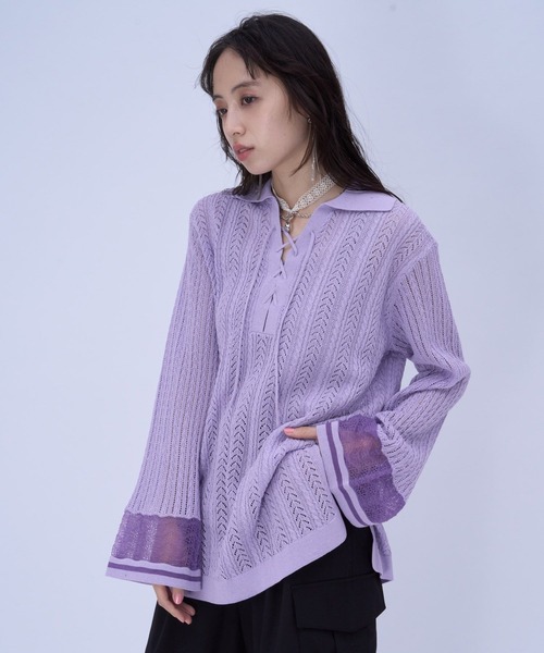 ーーー 胸元のレースアップと透け感が女性らしい Vネックサマーニットトップス ーーー point □袖口が微配色で編地が切り替わったデザイン □襟はスキッパーデザインでレースアップを施し、女性らしい抜け感をプラス □体型を隠せるミドル丈ゆったりシルエットでラフに着用できる □透かし編みで夏にも涼しく着用できる為、着こなし次第で長い季節着れるのがポイント □コットンポリ生地でお洗濯が可能 styling 骨格ナチュラル:薄手のシアートップスなどをインしてレイヤードスタイルが◎首が長いのでハイネック合わせなどが似合います。 骨格ウェーブ:ベルトを巻くか前だけインするスタイルで細見え効果を狙って下い。ボトムは細身よりフレアスカートやワイドパンツがおすすめ。 骨格ストレート:タンクトップ合わせで抜け感を出し、女性らしいスタイルに。ショートパンツやナロースカートなどアイテムでも女性らしくするのが似合います。 ※加工を施した画像を使用しております。 実物と色味が異なる可能性があるため、色味は詳細後ろにある生地寄り画像を参考にお願いいたします。 あらかじめご了承下さい。