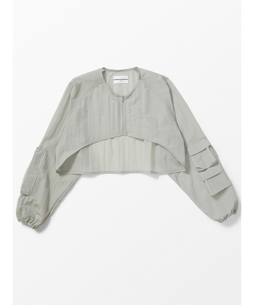 ■ショート丈のレイヤードジャケット。高い強度と撥水性、透湿性を備えた多機能なリップストップナイロンを使用。左右非対称の袖ポケットが特徴的なデザインとなっています。様々なアイテムとのレイヤードでコーディネートを楽しみたい一着です。