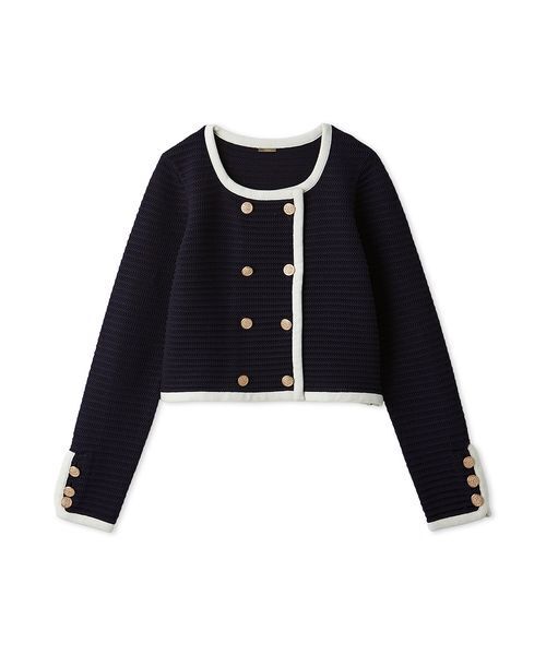 【マリンテイストを加えてトレンド感UPのクロシェライクカーディガン】【Design/Styling】クロシェ編みのような表情のある模様編みがトレンド感のあるニットカーディガンです。ボタンを2列にすることで今季らしいマリンテイストに仕上げました。ボタンはエレガントなチェックデザインのゴールドメタルボタンをセレクト。パイピングを施し、袖口にもボタンをプラスし、ジャケット風デザインに。程よく肉厚ながらシアー感のあるコットン混のニット生地は、ドライタッチな肌触りで軽やかに羽織っていただけます。【Fabric】ワンカラーのアイボリー、パイピングをホワイトで仕上げたネイビー、ブラックにホワイトのボーダーの3色展開。透け感:なし裏地:なし伸縮性:なし光沢感:なし生地の厚さ:普通【おすすめ骨格タイプ】■骨格ストレート■骨格ウェーブ■骨格ナチュラル※照明の関係により、実際よりも色味が違って見える場合があります。またパソコン・スマートフォンなどの環境により、若干製品と画像のカラーが異なる場合もございます。予めご了承ください。商品の色味は、商品単品画像をご参照下さい。 ※商品画像はサンプルのため、色味やサイズ等の仕様に変更がある場合がございますので、予めご了承ください。