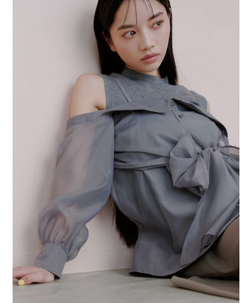 【胸元のリボンが華やかなオフショルデザインシャツとノースリニットトップスのセット】 【Design/Styling】 デザインシャツをボディに巻き付けたような華やかなレイヤードデザインが魅力的なニットトップスです。オフショルデザイン風のチュニック丈のシャツと、コンパクトなプチハイネックのノースリニットのセットで、それぞれ単品でもご着用いただけるデザインです。カラーによりシャツ生地の素材を変えてお作りしています。シャツは、たっぷりとギャザーを寄せた生地を脇から挟み込み、フロント胸下位置でキュッとリボン結びや固結びを作ってご着用いただくこなれ感のあるデザインです。絞り具合は調節可能なので、お好みの美シルエットにてご着用いただけます。オフショル風デザインシャツですが、ショルダーストラップを施しているので安心してご着用いただけます。 【Fabric】 シャツもニットも無地のホワイトで合わせたホワイト、透け感・艶感のあるシアーシャツに杢調の濃いめグレーニットを合わせたグレー、ブルーストライプシャツとサックスブルーニットを合わせたサックスブルーの3色展開です。 透け感:なし 裏地:なし 伸縮性:なし 光沢感:なし 生地の厚さ:普通 【おすすめ骨格タイプ】 ■骨格ストレート ■骨格ウェーブ ■骨格ナチュラル ※照明の関係により、実際よりも色味が違って見える場合があります。 またパソコン・スマートフォンなどの環境により、若干製品と画像のカラーが異なる場合もございます。予めご了承ください。 商品の色味は、商品単品画像をご参照下さい。 ※商品画像はサンプルのため、色味やサイズ等の仕様に変更がある場合がございますので、予めご了承ください。