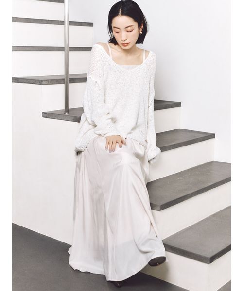 【風合いのあるざっくりスラブニットとレディなキャミソールワンピースのセット】 【Design/Styling】 ナチュラルな風合いのスラブニットとシルクライクな生地のキャミソールワンピースとのセットアイテムが到着。春気分を盛り上げる、今季らしいまろやかな色味で展開しています。凸凹とした表面感のスラブ糸を使用したゆったりとしたローゲージニットは、深めのV開きで抜け感をプラス。肩を落としたコケットな着こなしもおすすめ。ロング丈のエレガントなキャミソールワンピースは、程よい光沢感のある軽やかな生地で裾に向かって流れるようなラインを演出。高めのウエスト位置切り替えで美脚効果も抜群です。ショルダーストラップはリボンの長さで調節いただけるデザインです。ワンピースは裏地付き。被りでご着用いただけます。シンプルなデザインで、それぞれ単品でも活躍するアイテムです。 【Fabric】 アイボリー、イエロー、ラベンダーの3色展開です。 透け感:なし 裏地:なし 伸縮性:なし 光沢感:なし 生地の厚さ:普通 【おすすめ骨格タイプ】 ■骨格ストレート ■骨格ナチュラル ※照明の関係により、実際よりも色味が違って見える場合があります。 またパソコン・スマートフォンなどの環境により、若干製品と画像のカラーが異なる場合もございます。予めご了承ください。 商品の色味は、商品単品画像をご参照下さい。 ※商品画像はサンプルのため、色味やサイズ等の仕様に変更がある場合がございますので、予めご了承ください。