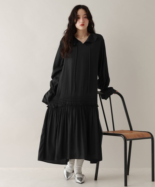 一枚で主役級◎なフリルワンピース。■おすすめの着こなし☆一枚で着るなら・・・軽く、抜け感のあるワンピースなのでメンズライクアイテムと合わせるのが◎ハンティングジャケットやベストなどと合わせて着用するのがおすすめです。☆レイヤードスタイルには・・・デニムをレイヤードして着用する、カジュアルなスタイリングが◎きれいめなスラックスと合わせて、落ち着いた印象で着るのもおすすめです。ーーー■ポイントふんわり揺れるスカートシルエット×フリルカラーがアクセントな一着。襟・袖・切り返し部分にフリルデザインが施されているので、女性らしい印象で着用いただけます。全体的にゆとりのあるシルエットなので、着るだけで体型カバー可能なのも嬉しいポイント◎襟部分の紐は垂らしていても、結んでリボンにしてもお洒落な雰囲気に。一枚でも着ても、レイヤードスタイルにしても着映える一着に仕上がりました。■素材光沢感があり、軽い着心地の混紡素材を使用。柔らかく肌触りも良いのがポイントです。