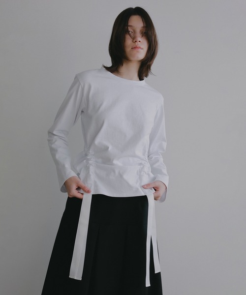 2026 Spring&Summer Collection サイドリボンカットトップス サイドにリボンを配したロングTシャツ。 ヴィンテージのような粗野感ある風合いのカットソー生地と光沢あるリボンのディテールがバランス良い一着。 カーブを描いたドロスト仕様になっており、丈の調節やギャザーデザインも楽しんでいただけます。 フレアスカートなどのときはしっかりギャザーを寄せて丈を短く、細身のパンツなどのときは緩めにしてオーバーサイズのトップスのようにスタイリングに合わせて調節していただくのもおすすめです。 ※照明の関係により、実際よりも色味が違って見える場合がございます。 またパソコン・スマートフォンなどの環境により、若干製品と画像のカラーが異なる場合もございますので、予めご了承ください。 商品の色味は、商品拡大画像をご参照下さい。