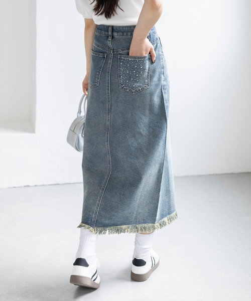 定番デニムに遊び心をプラス!裾フリンジラインストーンポケットデニムスカート 【デザイン】 裾のフリンジデザインとフロントスリットがポイントのデニムスカート。 ヴィンテージライクな色落ち加工で、こなれ感のあるスタイリングが簡単に完成します◎ さらに、バックポケットの片側にはラインストーンをあしらい、後ろ姿にさりげない輝きをプラス♪ シンプルなデザインの中に程よいアクセントを効かせ、大人カジュアルにもトレンド感を演出します。 【コーディネート】 ショート丈トップスやクロップドスウェットでカジュアルスタイルに。 シアーブラウスやリブニットと合わせてきれいめ大人コーデに♪ フリルブラウスやコンパクトカーディガンを合わせてフェミニンカジュアルも可愛いです◎ ********************** 透け感:なし 裏地:なし 伸縮性:なし ********************** 本体:洗濯機洗い可能 【※お取り扱い上のご注意】 1:モニター環境等により実際の商品と多少色味が異なって表示される場合がございます。予めご了承下さい。 2:屋外で撮影された商品は、天候により多少実際のカラーと異なる場合があります。商品のカラーはトルソー(マネキン)の商品画像をご参照ください。 3:濃い色の商品は、お洗濯や摩擦等による移染にご注意ください。 4:末永くご愛用頂く為に、アテンションタグ・洗濯ネームを必ずご確認の上、着用又はお取り扱い下さい。 5:生産時期により、色、サイズ、デザイン、素材の質感が多少が異なる場合がございます。あらかじめ御了承下さいませ。