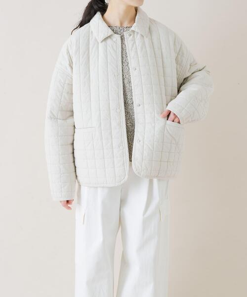 2月24日 新色(BEIGE)を追加しました 軽い着心地と程よいボリュームが、あらゆるスタイリングにフィット 正方形のキルトが特徴的なショートジャケット。目が詰まった細番手の平織りコットンを使用しています。裏地もコットンで天然素材の心地よさを感じていただける一品。寒さが残る春先に合わせやすく、コンパクトな襟と広がり過ぎないカーブした袖がポイントに。ご家庭の洗濯機で洗えるのも嬉しいです。パンツやスカートはもちろんワンピースともバランスが良く、様々なコーディネートに活躍しそうです。 【FABRIC】 ・さらっとした肌触り ・着ぶくれ感が気にならない程よいボリューム 【POINT】 ・春秋の2シーズン着まわせるアイテム ・シャープな印象を与えるスナップ釦 【2026 Spring/Summer】【26SS】 ※この商品は、縫製後、製品洗いをしています。そのため一点一点に微妙な色、サイズ、風合いなどに違いがあります。 ※商品の特性上、縫い目部分からダウンやフェザー、中綿などの詰め物が出ることがありますので、ご注意ください。 ※商品画像は、光の当たり具合やパソコンなどの閲覧環境により、実際の色味と異なって見える場合がございます。予めご了承ください。 ※商品の色味の目安は、商品単体の画像をご参照ください。 ▼お気に入り登録のおすすめ▼ お気に入り登録された商品は、マイページにて現在の価格情報や在庫状況の確認が可能です。 お買い物リストの管理にぜひご利用ください。 素材感 透け感 : なし 伸縮性 : なし 裏地 : あり 光沢 : なし ポケット : あり Free