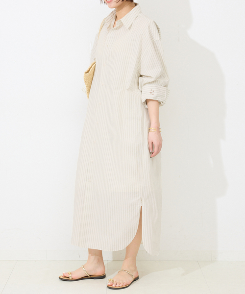 ペチコート付属/ボタン開き 【2026SS】 SLOBE IENA POINT ・サイドスリットが軽さを演出するような 春らしいストライプのシャツワンピース! 【素材の特徴】 きめ細かくなめらかなブロード素材を使用し、 程よいハリ感と軽やかさを兼ね備えた素材。 シルエットを美しく見せながらも、 さらっとした着心地でロングシーズン活躍します。 【デザイン】 足首部分のサイドスリットがロング丈でも軽やかな印象に。 歩くたびに動きが生まれ、すっきりとしたシルエットを演出します。 袖口を折り返すと星の刺繍がさりげないアクセントに。 ボタン開きの裏側にもロゴ刺繍を施し、 細部までこだわりました。 前を閉じてワンピースとしてはもちろん、 前開きで羽織りとしても着用可能です。 パンツやレギンスとのレイヤードもおすすめ。 【コーディネート】 きちんと感とリラックス感を両立した、 大人のデイリースタイルにぴったりのアイテムです。 ********************** 透け感:ややあり 裏地:なし(ペチコート付属) 伸縮性:なし 光沢感:なし 生地の厚さ:薄手 ********************** 《スタッフ名:Sally》 年齢:30代後半/身長:162cm/体型:細身/普段サイズ:M/着用サイズ:フリー サイズ感:足首が見えるくらいの着丈。全体的にゆったりしています。 素材感: 軽やかさがあり、万能に使えるようなシャツ素材。 着心地:締め付けがないので着やすいです。 ********************** ※取り扱いについては、商品についている品質表示でご確認ください。 こちらの商品は、SLOBE IENAでの取り扱いになります。 直接店舗へお問い合わせの際はSLOBE IENA店舗へお願い致します。 ※照明の関係により、実際よりも色味が違って見える場合があります。 またパソコン・スマートフォンなどの環境により、若干製品と画像のカラーが異なる場合もございます。 予めご了承ください。 ※商品の色味は、商品アップ画像をご参照ください。 ワンピース:洗濯機洗い(弱), ペチコート:洗濯機洗い(弱)