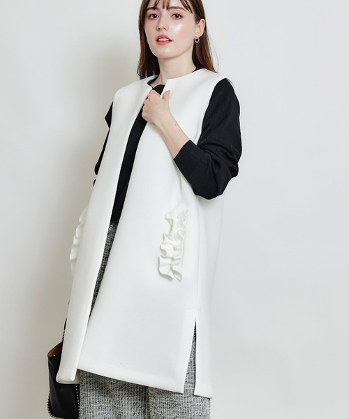 オンオフで活躍する大人レディなジレもちもちと弾力のあるダンボールニット生地を使用。軽くて柔らかく、ハリ感やシワになりにくいのが特徴です。また、伸縮性にも優れているので快適な着心地が感じられます。シンプルながらもポケットの立体的なフリルがアクセントになり、華やかさと可愛らしさのある一着です。あえてフロントにはボタン等は付けずに、サッと気負わずに羽織れるデザインに仕上げました。また、ノーカラーやサイドにスリットを入れ、動きやすさと軽さを出し、すっきり見えするシルエットに。どんなコーデにも合わせやすいベーシックなカラー展開で、デイリーコーデやオフィスカジュアルにもぴったりです。ブラウスやタイトめのトップスはもちろん、広めのアームホールなので、肉感のあるトップスとも合わせやすくなっています。シンプルでありながらも、羽織るだけで洗練された大人スタイルが完成する一着です。【詳細情報】厚み:□薄手 □ふつう ■厚手透け感: ■なし □あり光沢感: ■なし □あり伸縮性: □なし ■あり裏地: ■なし □ありポケット:□なし ■あり重量: 約640g※撮影場所や明るさにより実際の商品と色味が若干異なる場合がございます。 ☆商品のお気に入り♡登録を押せば”再入荷通知”や”残りわずか通知” 値下げのお知らせが届きます!お気に入りのブランド登録していただければ新商品入荷のお知らせも届きますので是非登録してみて下さい。