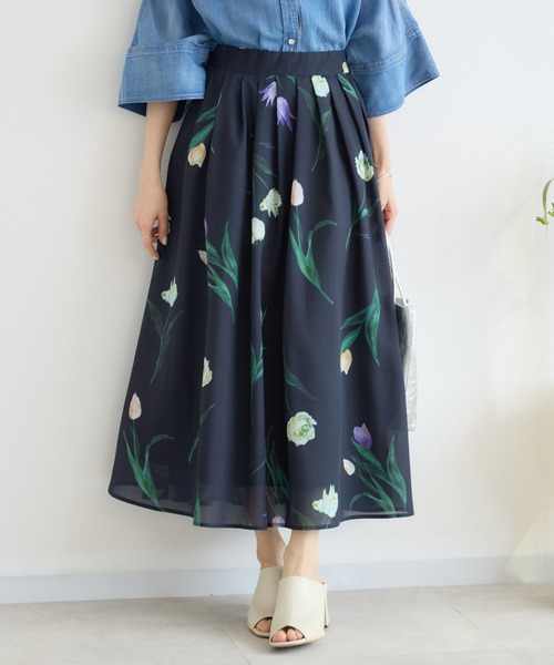 【KATHARINE ROSSオリジナル】 「春の象徴」であるチューリップだけを描いた、特別なオリジナルプリントが誕生! 100種類以上も存在するチューリップの中から厳選し、表情の異なる4つのモチーフを一枚の中に贅沢に描き分けています。 [素材] ・生地には、コットンのようなナチュラルな風合いを持つポリエステルローンを採用。 ・程よい透け感と軽やかさがありながら、大人の女性にふさわしい上品な光沢感を備えています。 [デザイン] ・贅沢に生地を使用し、裾に向かって美しく広がるフレアシルエットのロングスカート。 ・ウエストの下の位置から複数のタックを入れることで、腰回りのボリュームを抑えつつ、裾に向かって広がる立体的なシルエットを作り出しました。 ・ウエスト部分はサイドはシルエットを崩さないファスナー開きでスタイリッシュに仕上げつつ、後ろウエストはゴム仕様を採用。 ・日常使いに嬉しい右側ポケット付きで、ちょっとした小物の持ち運びにも便利。 ・また、滑らかな裏地付きなので、透けを気にせず安心して着用いただけます。 [スタイリング] ・同シリーズのブラウスをインして合わせれば、ドレスのように華やかで、結婚式の二次会やホテルランチにも映える気品溢れる装いに。 ・クリーンな白Tシャツにカーディガンを肩掛けし、足元にスニーカーを添えるだけで、春の街歩きにぴったりな軽やかで上品な休日スタイル。 ■光沢感:微光沢 ■透け感:なし ■伸縮性:なし ■生地の厚さ:薄手 [チューリッププリントプリントシリーズ商品] ブラウス(品番:44697) パンツ(品番:44704) ※照明や光の当たり具合で色味が違って見える場合があります。 ※システムの都合上、店舗より入荷が遅れる場合がございます。