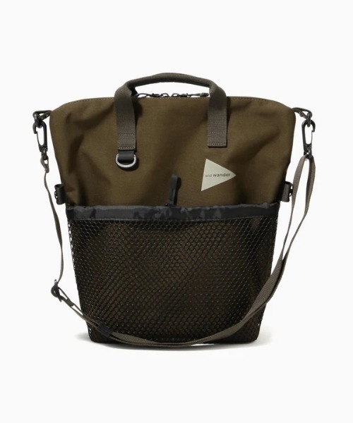 and wander/アンドワンダー PE/CO 2way bag経糸にポリエステル、緯糸にはコットンとナイロンの混紡糸を打ち込み、裏面にはTPUコーティングを施しています。耐水圧10000mmの防水性能を持ちながら、コットンの混率が半分ほどあるので、色や素材感の経年変化を楽しむことができるハイブリッド素材です。トートバッグ、ショルダーバッグ、2通りの使い方が可能です。実測容量9L【and wander/アンドワンダー】雨にふられるのも風にふかれるのも歩くのも山は楽しいand wander / 池内啓太、森美穂子2011春夏からブランドスタート。アウトドアフィールドで役立つアイテムを展開しています。アウトドアでの経験やアイデアを活かし、テストを繰り返しながらアイテム作りをしています。週末は山へ新しいアイテムを試しにいってきます。
