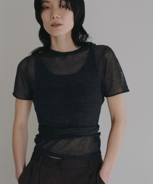 ナチュラルな風合いで仕立てたニットトップス。ウエストリボンをぐるりと巻いたり、結んだりと自由にアレンジできるスリーブレストップスと、シンプルなクルーネックの半袖を重ねたレイヤードアイテムです。度目を甘く仕上げた、透け感のある軽やかな編み地。纏うだけで、ニュアンスのあるスタイリングが完成します。それぞれ単品でも着用可能。半袖としてシンプルに着たり、他のアイテムに重ねてアレンジするのもおすすめです。