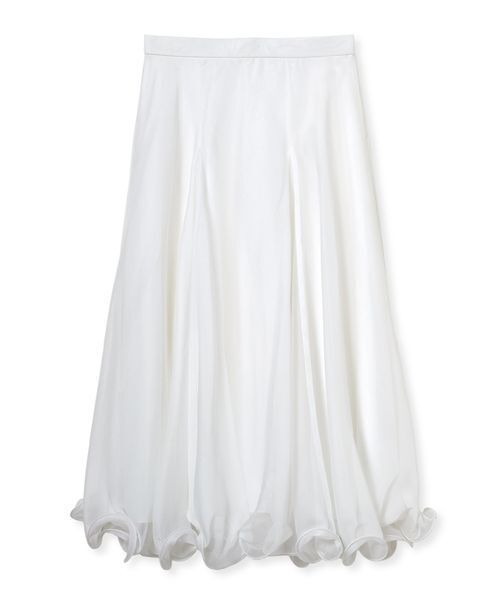 動きのある裾周りがポイントのシアーフレアスカート。 裾に太いテグスを入れることで大きなうねりを作り出しています。ウエストはあえてギャザーやタックを入れず、すっきりとさせることで裾のボリュームを際立たせたデザインに。 抑揚のあるヘムライン、オーガンジーの素材を活かした程よいハリと軽やかな透け感は春のコーディネートを華やかに彩ります。全色同色系の裏地が付きます。 透け感:あり 裏地:あり 伸縮性:なし 光沢感:ややあり 生地の厚さ:薄手 ※照明の関係により、実際よりも色味が違って見える場合があります。 またパソコン・スマートフォンなどの環境により、若干製品と画像のカラーが異なる場合もございます。予めご了承ください。 商品の色味は、商品単品画像をご参照下さい。 ※商品画像はサンプルのため、色味やサイズ等の仕様に変更がある場合がございますので、予めご了承ください。