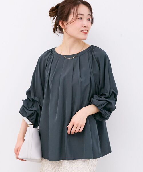 スリーブのタックデザインとボリュームのあるフォルムが目を惹くブラウス。 フロントにもタックデザインと落ち感のあるサテン素材を使用しオンオフ兼用で着まわして着るのも魅力。 ●ポイント 袖に入れたタックで立体感が生れる、変形スリーブのデザインが特徴です。 程よくゆとりのあるサイジングで身体のラインも拾わず初夏まで快適に着られる7分袖で幅広いコーディネートに合わせられるブラウスです。 インナーにシアータートルとのレイヤードスタイルもおすすめです。 ※取り扱いについては、商品についている洗濯表示にてご確認下さい。 ※照明の関係により、実際よりも色味が違って見える場合があります またパソコン・スマートフォンなどの環境により、若干製品と画像のカラーが異なる場合もございます。 ※商品の色味は、商品アップ画像をご参照ください。 【注意事項】 ・画像の商品はサンプルです。 ・サイズ表記はあくまで目安となります。 実際の商品と仕様、加工が若干異なる場合があります。