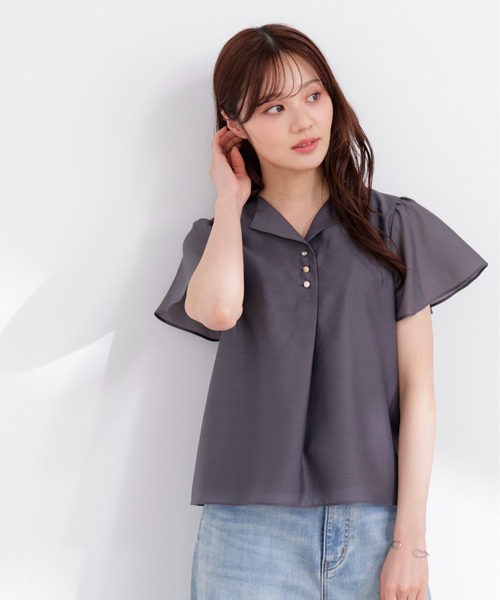 襟元をすっきり見せる開襟デザインのキレイめブラウス。デイリーはもちろん、通勤にも使いやすい上品なデザインです。フレアスリーブでさりげなく二の腕をカバー。表面感のあるシアー素材で程よくカジュアルダウンされ、オンにもオフシーンにも着回せます。<素材>ソフトシアーを使用しています。<詳細>仕様・前ボタン裏地・あり透け感・ややあり / 光沢・なし / 伸縮性・なし生地の厚さ・薄手※モデルの着用画像の場合、光の当たり具合により、実際の色味と異なって見えることがございます。色味は、商品単体の画像をご参照ください。<商品のお気に入り登録>お気に入りアイテムの値下げ・再入荷・在庫1点などの通知を受け取ることができる便利機能ですので気に入ったアイテムはお気に入り登録がおすすめ!<ショップのお気に入り登録>新商品や再入荷、セール、クーポン配布などお得な情報を受け取ることができます。●撮影はサンプル商品で行っている為、仕様とサイズが異なる場合がございます。●スタジオ及び屋外で撮影した着用画像は、光の当たり具合で色味が違って見える場合があります。予めご了承ください。