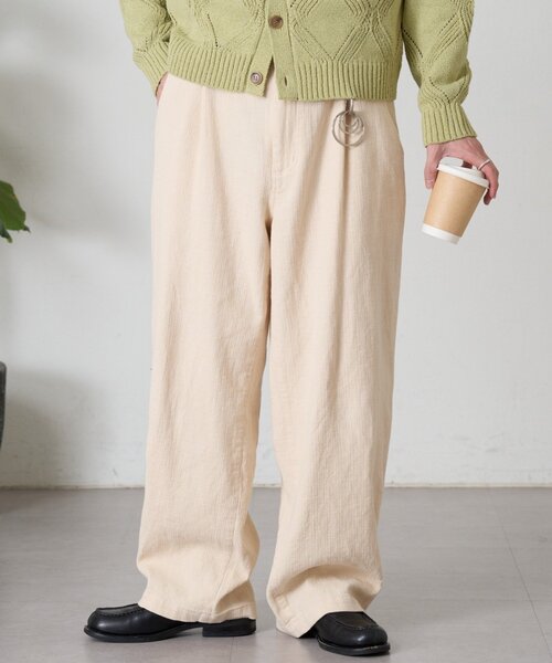 楽に履けて癖になる触り心地♪ユニセックスで履けるリラックスパンツが登場!!■デザイン綿に麻をブレンドすることで、やわらかさとサラッとした着心地に。表面に凹凸感のある生地が無地ながら春夏っぽくコーデを演出してくれます。シルエットは太すぎず細すぎない、絶妙なワイドストレート。ストンと落ちるラインが縦の印象を強調し、ラフになりすぎず大人っぽくもスタイリング可能。ウエストの後ろをゴム仕様にし、内側は紐付きでサイズ調節らくちん。さらにベルトループ付きで、ベルトを締めきちんとめな雰囲気にも◎両サイドと後ろのポケットなど実用性も抜かりない仕様です。■スタイリングシンプルTやシャツを合わせるだけでも、表情のある生地がお洒落な雰囲気に!すとんとしたシルエットは、トップスをタックインしたスタイリングにも相性が良いです。カジュアルにスニーカーサンダルから、きちんと感のあるレザーシューズまでテイストに合わせて幅広く組み合わせていただけます。■お手入れ方法洗濯:液温は30℃を限度とし、洗濯機で弱い処理が出来るアイロン:底面温度150℃を限度としアイロン仕上げが出来る。タンブル乾燥:不可・・・・・・・・・・・・・・・・・・・・・・透け感:なし裏地:なし伸縮性:なし(ウエストはゴム)光沢感:なし生地の厚さ:普通・・・・・・・・・・・・・・・・・・・・・・▼気になる商品をお気に入り登録ハートをクリックして《お気に入り登録》がオススメです!入荷情報や、クーポン情報が通知されるようになります。※画像の商品はサンプルを使用しております。実際の商品と若干の仕様が変更になる場合がございますので、予めご了承の上ご注文くださいますようお願いいたします※屋外の光や照明の当たり具合で、実際の商品の色味とカラー別画像の色味に若干の違いが発生する場合がございます。詳細画像と併せてご確認の上、ご注文いただきますようお願い致します。※独自のタイムセールなどの施策により、実店舗と価格差が発生する場合がございます。※実際の店舗在庫につきましては、各店舗に直接お問い合わせください。