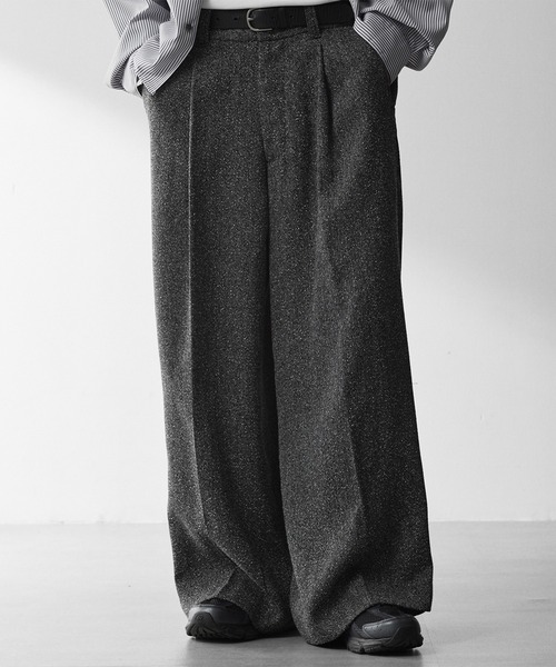 -【RUUBON】New Item Release - 【流れるタックが魅せる、品のあるストレートシルエット】 フロントの1タックから美しく流れるタックラインが印象的な、セミワイドストレートパンツ。 腰まわりに程よいゆとりを持たせつつ、裾にかけてすとんと落ちるシルエットで、洗練された大人のバランスを演出します。 フロントはホック×内掛け釦仕様を採用し、ベルトを着用しなくてもミニマルでクリーンな見え感に。 バックウエストにはゴムを内蔵しており、フィット感を保ちながらもリラックスした穿き心地を実現しています。 ベルトループ付きのため、スタイリングに合わせたアレンジも可能です。 ポケットはサイドスラッシュポケット2箇所、バックポケット2箇所の計4箇所を配置。 バックポケットは両玉縁仕様を採用し、後ろ姿までスッキリと上品な印象に仕上げています。 フロントファスナーには信頼性の高いYKKを使用し、釦には水牛調のさり気ない柄を施したものを採用。 実用性とデザイン性の両立を追求し、細部にまでこだわった一本です。 【ネップの表情が、コーデに奥行きをプラス】 TR合繊素材をベースに、ポリウレタンをブレンドしたネップツイードライク素材を使用。 複数の色が混ざり合った奥行きのある表情と、フラットになりすぎない凹凸感が特徴で、シンプルながらも存在感のある仕上がりです。 レーヨン混ならではの落ち感と柔らかさがあり、肌当たりは比較的なめらか。 チクチク感を抑え中肉厚で程よく落ち感のある生地感のため、ミドルシーズンにも対応。 シャツやニットなどベーシックなトップスと合わせることで、ボトムスを主役にしたスタイリングが完成します。 派手すぎず、日常のコーディネートに取り入れやすい素材感とカラー設計もポイントです。 ※素材の特性上、引っ掛かりやすいため、アクセサリーなど鋭利な物との接触にはご注意ください。 【静かに際立つ上質感。シンプルがいちばん映えるパンツ】 ネップツイードライク素材の表情を活かすため、トップスはシンプルにまとめるのがおすすめ。 素材感とシルエットが引き立ち、洗練されたスタイルに仕上がります。 クリーンな無地シャツをタックイン、または軽く前だけインすることで、大人のきれいめスタイルに。 シンプルなアイテムと合わせるだけで、素材の奥行きと上品な存在感を楽しめる一本。 オン・オフ問わず、幅広いシーンで活躍します。 【取り扱い上のご注意】 ※素材の特性上、引っ掛かりやすいため、アクセサリーなど鋭利な物との接触にはご注意ください。 ・漂白,蛍光増白剤の使用禁止 ・洗濯ネット使用 ・濃色,淡色は分けて洗って下さい ・つけ置き,濡れた状態での放置禁止 ・洗濯後はすぐに形を整え日陰で干す ・アイロンはあて布使用 ・濃色は摩擦(特に湿った状態)や雨・汗等で他の物に色が移る事があります ・直射日光等により変色や退色することがありますのでご注意下さい ・着用やクリーニングを繰り返すことにより、徐々に色落ちする場合があります。 【 RUUBON/ルーボン 】 素朴で飽きのこないデザインと体型問わず着やすいシルエットを追求。 日常にさりげない幸せをもたらすユニセックスブランド。 ▼商品のお気に入り登録 完売カラーの再入荷通知や、ラスト1点、セールの通知をお知らせいたします。 ▼ブランドお気に入り登録 新商品や再入荷など、いち早くブランドの情報を受け取ることができます。