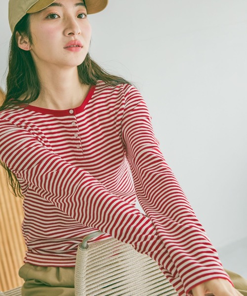 ヘンリーネックで作る、最旬シティガール ■素材特性 肌なじみの良い綿をベースにした、柔らかくさらりとした質感。 そこにポリウレタンをほんのり配合することで、体の動きにしなやかにフィットする絶妙なストレッチ性をプラスしました。 ■デザイン 細めのピッチが大人っぽい、表情豊かなボーダーカットソー。 定番のボーダー柄にヘンリーネックのアクセントをプラスし、一枚でサマになるアイテムに仕上げました。 主役にも脇役にもなる着回し力が魅力の1着です! ■おすすめスタイリング デニムやチノパンにさらっと合わせるだけで遊び心のあるボーイッシュなスタイルが完成! アクセントにキャップをプラスすれば、旬な都会派カジュアルが楽しめます。 サロペットやベストのインナーとしても◎ 首元からチラリと配色ラインを覗かせるだけで、コーディネートの鮮度がぐっと上がります◎ ※サンプルにて撮影をしておりますので、実際の商品とは仕様や加工・サイズ等が若干異なる場合がございます。 ※屋外の光や照明の当たり具合で、実物と色味が異なって見える場合がございます。詳細画像の色味をご確認ください。 なお、商品の色や質感を出来るだけ忠実に再現するよう心掛けておりますが、パソコンなどの環境により、実物と若干異なる場合がございます。 ※写真を許可無くコピー・転用することは固くお断りします。