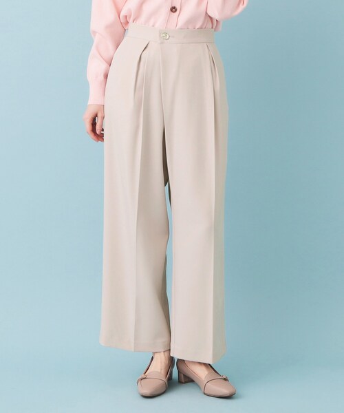 フロントラップ風に変形ゴールド釦がアクセントのハイウエストワイドパンツ 【デザイン】 ・フロントラップ風のデザインが特徴的なハイウエストワイドパンツ。 ・スタイリッシュなシルエットが、脚を長く見せ、クリーンな印象を与えます。 ・変形ゴールド釦がアクセントになり、シンプルさの中に洗練された雰囲気を演出。 ・リラックス感のあるゆったりとしたワイドシルエットが動きやすさを確保し、カジュアルシーンでも活躍。 ・様々なトップスとも合わせやすく、コーディネートの幅を広げます。 【素材】 ・軽やかなストレッチツイル素材が、快適な着心地を実現し、長時間の着用でも快適。 ・通気性も良く、季節の変わり目でも快適に着られるデザインが魅力です。 ・イージーアイロン仕様により、シワになりにくく、いつでもきれいな状態をキープ。 ・洗濯機OKで、日常的なお手入れが簡単なのが嬉しいポイント。 【仕様】 ・ポケット数:横×2 後飾りポケット×2 ・前ファスナー ・ウエスト後ろゴム ・裏地なし ※こちらの商品はやや透け感があるため、インナーの着用をおすすめします。 ※照明の関係により、実際よりも色味が違って見える場合があります。また、パソコン・スマートフォンなどの環境により、若干製品と画像のカラーが異なる場合もございます。 モデル情報:身長163cm B81 W56 H82 着用サイズ:38(M) 店舗へのお問い合わせ商品番号:C58-65025 ●製品寸法: 36(S):W60~64cm H90cm 股下65cm 前股上32cm 渡り幅31cm 裾幅23cm 38(M):W64~68cm H91cm 股下67cm 前股上33cm 渡り幅32cm 裾幅25cm 40(L):W68~72cm H92cm 股下70cm 前股上33cm 渡り幅33cm 裾幅27cm 備考: