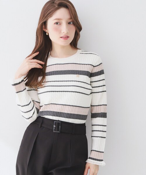 ランダムボーダーにゴールドパーツが可愛いケーブルニット 【デザイン】 ・ランダムボーダーがアクセントになった、スタイリッシュなケーブルニット。 ・シンプルながら印象的なゴールドパーツがさりげない華やかさを添え、コーディネートの主役に。 ・リブ編みのディテールがボディラインにフィットし、すっきりとしたシルエットを演出。 ・カラーバリエーションのグラデーションが、さまざまなシーンにマッチ。 ・ネックラインは程よい開き具合で、顔周りを明るく見せるデザインです。 【素材】 ・コットン混の良質なニット素材が、温かさを保ちながらも通気性を確保。 ・柔らかな肌触りで、デイリーユースに最適な快適性を提供。 ・ストレッチ性に富み、動きやすさを実現したデザインが魅力です。 ・洗濯機OKで、お手入れが簡単な機能性を持ち合わせた一枚。 ・坑ピル加工により、毛玉ができにくい特性を備え、長くきれいな状態で着用可能。 ※照明の関係により、実際よりも色味が違って見える場合があります。また、パソコン・スマートフォンなどの環境により、若干製品と画像のカラーが異なる場合もございます。 モデル情報:身長163cm B81 W56 H82 着用サイズ:38(M) 店舗へのお問い合わせ商品番号:C58-15036 ●製品寸法: 36(S):着丈49cm B80cm 袖丈52cm 肩幅30cm 38(M):着丈50cm B84cm 袖丈53cm 肩幅31cm 40(L):着丈51cm B88cm 袖丈54cm 肩幅33cm 42(LL):着丈52cm B92cm 袖丈55cm 肩幅35cm 備考: