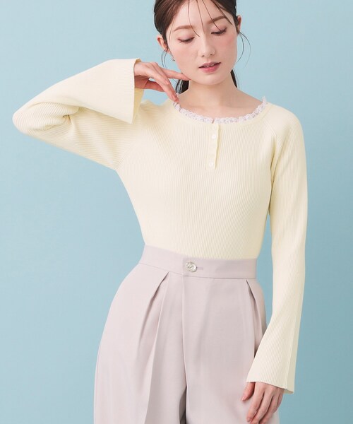 レーストリムにヘンリーネックで甘さを抑えたフレアスリーブニット 【デザイン】 ・レーストリムが施されたヘンリーネックが特徴的な、フレアスリーブのニット。 ・控えめな甘さが大人の女性にぴったりなデザインで、普段使いにも特別な日にも活躍。 ・フレアスリーブが腕に柔らかさを演出し、上品な印象を与える一着。 ・リブ編みのテクスチャーがシルエットにメリハリをつけ、スタイルを際立たせます。 ・シンプルながらも存在感のあるデザインで、レイヤードスタイルにも重宝します。 【素材】 ・柔らかい合繊ニット素材が肌に優しく、快適な着心地を提供します。 ・ニット特有のストレッチ性があり、動きやすさを兼ね備えたデザインが魅力。 ・通気性、肌触りが良いため、長時間の着用でも安心。 ・洗濯機OKで、日常使いに嬉しいお手入れの簡単さを実現。 ※照明の関係により、実際よりも色味が違って見える場合があります。また、パソコン・スマートフォンなどの環境により、若干製品と画像のカラーが異なる場合もございます。 モデル情報:身長163cm B81 W56 H82 着用サイズ:FREE 店舗へのお問い合わせ商品番号:C58-15037 ●製品寸法: FREE:着丈48cm B68cm 裄丈72cm 備考: