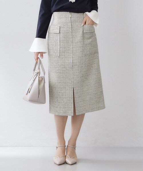 ツイード調のニュアンスが光る、大人の上品さをまとうタイトスカート 【デザイン】 ・ツイードミックス風の素材感が特徴で、シンプルながらも奥行きのある印象を演出。 ・腰まわりをカバーするサイドポケット付き。デザイン性と機能性を両立しました。 ・フロントファスナーとスリットを採用し、上品さを保ちながら脚さばきの良さを実現。 ・後ろウエストはゴム仕様になっており、程よいフィット感と快適な着心地を提供。 ・程よいタイトシルエットで、シャツを合わせたきちんとしたコーデからニットを合わせたリラクシーなスタイルまで幅広く対応可能。 【素材】 ・軽量で柔らかな素材感ながら、ツイード風のミックス感が上品な仕上がりに。 ・家庭で簡単に洗えるマシンウォッシャブル仕様。日常使いにぴったりの実用性が魅力です。 【仕様】 ・ポケット数:横×2 ・前ファスナー ・ウエスト後ろゴム ・裏地あり ※照明の関係により、実際よりも色味が違って見える場合があります。また、パソコン・スマートフォンなどの環境により、若干製品と画像のカラーが異なる場合もございます。 モデル情報:身長159cm B75 W56 H81 着用サイズ:38(M) 店舗へのお問い合わせ商品番号:C58-75020 ●製品寸法: 36(S):W60~64cm H82cm 総丈68cm 38(M):W63~67cm H85cm 総丈69cm 40(L):W66~70cm H88cm 総丈70cm 42(LL):W70~74cm H92cm 総丈71cm 備考: