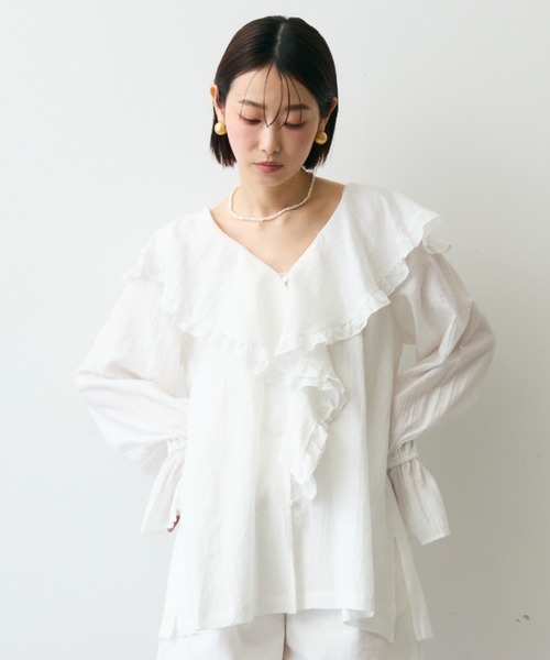--- Trish NEW ARRIVAL TREND ITEM! --- 【2026 SS COLLECTION】 BLU(LAVENDER)に近いカラー、BLK 新色登場 華やかなラッフルデザインが目を惹くフリルブラウス。フロントから襟元にかけて流れるように施されたフリルが、女性らしい柔らかさと立体感を演出します。ほんのりシアーな素材感で軽やかに揺れ、抜け感のあるVネックラインがデコルテを美しく見せてくれる一枚です。袖口にもギャザーを寄せ、ボリュームを持たせたシルエットが上品なアクセントに。デニムと合わせてカジュアルに、スカートやスラックスと合わせてフェミニンにと、幅広いスタイリングを楽しめます。 ●透け感:あり ●伸縮性:なし ●光沢:なし ●生地の厚さ:薄め --- ATTENTIO--- N ---※撮影場所やお使いのモニター環境により若干お色味が異なる場合がございます。ご了承下さい。 ※製品によっては染料の特性上、湿った状態や汗をかいた状態での長時間の放置、または摩擦により、他のものへ色移りする恐れがありますので、着用時にはご注意下さい。 ※風通しがよく、湿気の少ない日の当たらない場所で保管して下さい。 ※製品加工上、お手元に届く際ににおいが生じる場合がありますが、 ご使用を続けていく事によりにおいは軽減されます。 --- INFORMATION --- 〈商品のお気に入り登録〉 カートの右のハートをクリック!完売カラーの再入荷通知を受け取ることができます。 〈ブランドのお気に入り登録〉 ブランド名をクリック!新商品や再入荷の通知を受け取ることができます。 〈ブランド公式SNS〉 Instagram: @trish.tokyo ZOZOTOWNに掲載していない入荷情報やお得な情報なども随時更新中◎ 是非チェックしてみてください。 ※他のキャンペーンにより、期間中に価格が変動する場合があります。 SALEは予告なく終了させていただく場合もあります。 ※他のキャンペーンにより、期間中に価格が変動する場合があります。 ※セールは予告なく終了させていただく場合もあります。 ※袋梱包の為、染料による特有の匂いが抜けきれず、匂いがする場合がございますが不良品にはあたりません。 上記注意点での返品、交換はお断りします。ご了承の上お買い求めくださいませ。 ※本製品は生産過程におきまして色味、サイズ感等若干の誤差が出る場合がございます。予めご了承くださいませ。 ※ご注文いただいた予約商品のお届け時期の確認は、注文履歴ページより行えます。
