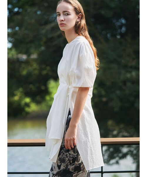KNOT DESIGN BL ポコポコした表面感とサラっとした風合いの清涼感のある素材を使用したデザインブラウス。 ふんわりフォルミースリーブが二の腕をカバーし女性らしい雰囲気に。 フロントのノットデザインがアクセントとなり1枚で決まるトップス。 深めのスリットが入ったイレギュラーヘムが軽やかな印象をプラス。 ワイドパンツ、アイラインスカート、細身パンツなど幅広いボトムとバランスもとりやすいアイテム。 ・・・・・・・・・・・・・・・・・・ 透け感:オフホワイトのみややあり 裏地:なし 伸縮性:なし 生地の厚さ:普通 ・・・・・・・・・・・・・・・・・・ 【 お買いものにおすすめの便利機能! 】 ▽商品のお気に入り登録 完売カラーの再入荷時や、ラスト1点の時、セール開始時にお知らせします。 ▽ブランドのお気に入り登録 新商品や再入荷、セール情報など、いち早くブランドのお得な情報を受け取ることができます。 ぜひご活用ください。 ※実際にお届けする商品と仕様やサイズが異なる場合がございます。 また生産の都合上、お届け時期が前後する場合がございます。