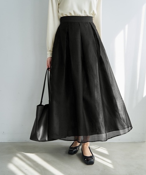 軽さとシンプルさに、さりげないデザイン性。 レース調素材でも甘くならず、スポーツ感も出ない、品良く使える春夏スカート。 メッシュ状の生地を重ねたフレアシルエット。網のようなスポーティ素材ではなく、レースリボンを格子状に重ねたような質感で、大人らしいキレイめ感が魅力です。程よいハリがあり、広がりすぎず美しいフレアラインをキープ。シンプルながらも普通すぎない絶妙なバランスで、幅広いコーデに馴染みます。 ウエストは背面ゴム+ファスナー仕様で、ヒップを気にせずスムーズに着脱可能。裏地は裾近くまで入っており脚はきちんと隠れます。柄レースのような甘さがないため、フェミニンにもハンサムにも寄せられる万能デザイン。スニーカーからパンプスまで靴を選ばず、身長を問わずバランス良く穿けます。 軽量で衣擦れ音もなく、シワになりにくい扱いやすい素材感。真夏も着用可能ですが、特別涼感素材ではありません。ホワイトは透け対策としてベージュ系インナーやペチコートの着用がおすすめです。 【その他の仕様】 ◆着用時期:3-10月目安 ◆サイズ感:S-Lサイズに対応 ◆丈感:くるぶし程度 ◆シルエット:フレア ◆ウエスト:背面ゴム仕様 ◆ベルトループ:なし ◆厚み:表地は薄手/裏地は普通 ◆柔らかさ:ハリ感と柔軟性が共存 ◆肌触り:表地はサラッとした感じ/裏地はスルスルとした感じ ◆着用ジワ:できにくい ◆毛羽立ち:できにくい ◆伸縮性:ややあり ◆光沢感:なし ◆スリット:なし ◆着脱:背面中央にファスナーあり(ホックなし) ◆ポケット:なし ◆裏地:あり ◆手洗い:可能 ◆裾上げ:お直しに出していただけます ◆アイロン:不要 ◆スチーマー:使用OK 【お色について】 ◆ブラック:定番的な通常のブラックです。 ◆ホワイト:一般的な白いお洋服のお色。イエロー味などの色味感は無いクリアな発色のホワイトです。