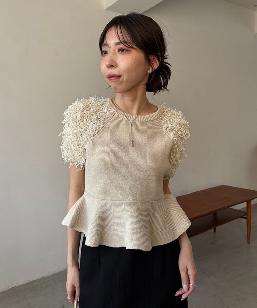 ボリューム感のある袖のフリンジが一癖効いた着映えニット 商品ポイント ・着ぶくれしないよう袖のみフリンジに切り替えた半袖ニット ・やや落ち感のある糸をミックスさせた表情のあるフリンジデザイン ・ハイウエスト位置で切り替えたペプラムがスタイルアップ効果抜群 ・コンパクトな作りですっきり見え ・チャコールは身頃とフリンジが配色になった一癖あるデザイン スタイリングポイント ・マキシIラインスカートと合わせてきれいめに ・デニム合わせでカジュアルダウンもおすすめ 【ホワイト着用アイテム】セミフレアデニム 【ベージュ着用アイテム】【お気に入り累計2万超え/全骨格◎/低身長サイズ】マキシIラインスカート 【チャコールグレー着用アイテム】【低身長サイズあり】カーブタックベルト付パンツ 【チャコールグレー着用アイテム②】ダンボールカーブパンツ ********************** 透け感:なし 裏地:なし 伸縮性:あり 光沢感:なし ********************** ※店舗へは3/31の入荷を予定しております。 (配送状況等により予告なく日程が変動する場合がございます。) ▼洗濯方法 手洗い可能 ※クリーニングの際は洗濯ネットを使用してください。 ※着用時にベルト・バッグ・アクセサリー周囲の壁など表面の粗いものとの摩擦や、引っ掛かりにご注意ください。 ※撮影場所やお使いのモニター環境により若干お色味が異なる場合がございます。 特にロケの撮影では明るく見える傾向にございます。 ※商品はサンプルで撮影をしております。若干の仕様が変更になる場合がございますので予めご了承の上ご注文くださいますようお願いいたします。 ▼商品のお気に入り登録 完売カラーの再入荷通知や、ラスト1点の通知、セールの通知も受け取ることができます。 ▼ブランドのお気に入り登録 新商品や再入荷など、いち早くブランドのお得な情報を受け取ることができます。