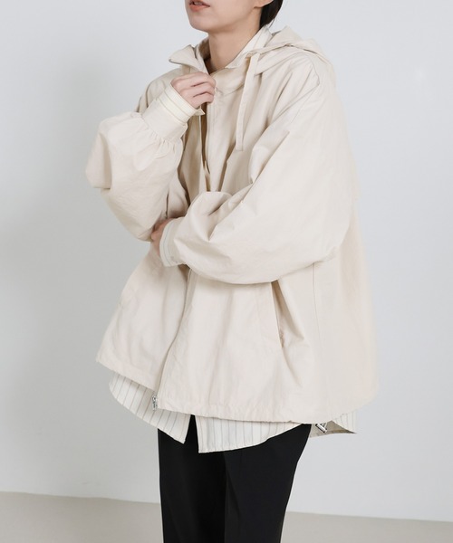 -point- & -styling- 季節の変わり目に活躍するマウンテンパーカー。 軽量なナイロン素材を使用し オーバーサイズにドロップショルダーがこなれた印象を叶えてくれる1着。 裾に前後差がありドロストも付いているので、 ボトムスに合わせてシルエットを変えてメリハリをつけやすいのもポイント。 カジュアルになりすぎないように袖口は半分ゴムにし 大人の女性も着やすいデザインに仕上げました。 毎朝迷わず手に取れる、着回し自在な一着です。 オーバーシルエットなので厚手のトップスもインしやすく、 シワにもなりにくいので、たたんでバックに入れて持ち運びも可能です。 軽量フーディーアウター ---------------------------- 素材 (表地)ナイロン100% (裏地)ポリエステル100% ---------------------------- 伸縮性 ★★☆☆☆ 裏地 あり ---------------------------- ※モニター・環境等により実際の商品と多少色味が異なって表示される場合がございます。 予めご了承をお願いいたします。 ======================= ■袋梱包の為、染料による特有の匂いが抜けきれず、匂いがする場合がございますが不良品にはあたりません。 上記注意点での返品、交換はお断りします。ご了承の上お買い求めくださいませ。 ■本製品は生産過程におきまして色味、サイズ感等若干の誤差が出る場合がございます。予めご了承くださいませ。 ======================= 【お買いものをお楽しみいただく為に!】 ▼商品のお気に入り登録 完売カラーの再入荷通知や、ラスト1点の通知、セールの通知も受け取ることができます。 ▼ブランドのお気に入り登録 新商品や再入荷など、いち早くブランドのお得な情報を受け取ることができます!