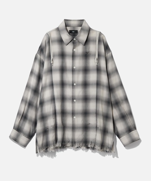 ーーー 肩ジップとダメージ加工がグランジな個性を刻む、HAREだけのデザインチェックシャツ。 ーーー DESIGN 大人気の「ダメージZIPカーディガン」の系譜を継ぐ、HAREならではのエッジの効いたデザインシャツが登場。 ボディや裾に施された大胆なダメージ加工が着古したようなグランジ感を演出。 最大の特徴である肩のジップデザインは、閉めればメタルパーツがアクセントになり、開ければインナーの色や肌を覗かせるレイヤードスタイルへと変化します。 シルエットはゆったりとしたオーバーサイズに設定。体のラインを拾わないため、体型カバーを気にする女性のお客様にもおすすめできる、ジェンダーレスな仕上がりです。 MATERIAL モードなモノトーンと、トレンド感のあるミントカラーのチェック生地を使用。 薄手の軽やかな素材感で、ジップを開けた際も生地が自然に落ち、動きのあるドレープを作り出します。 ※サンプルにて撮影をしておりますので、実際の商品とは仕様や加工・サイズ等が若干異なる場合がございます。 ※屋外の光や照明の当たり具合で、実物と色味が異なって見える場合がございます。詳細画像の色味をご確認ください。 なお、商品の色や質感を出来るだけ忠実に再現するよう心掛けておりますが、パソコンなどの環境により、実物と若干異なる場合がございます。 ※写真を許可無くコピー・転用することは固くお断りします。