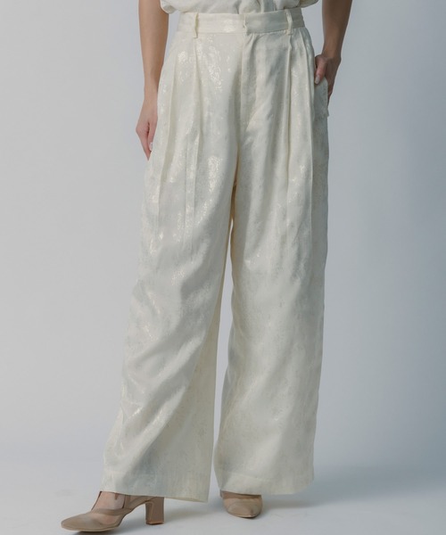 さりげなく浮かび上がる箔押しプリントが、装いに奥行きを与えるタックパンツ。 一見シンプルながらも、細部にこだわったデザインで、1枚でスタイリングが完成する主役級アイテムです。フロントに施した控えめなタックが、立体感のある美しいシルエットを演出し、きれいめな印象に。 ウエストはフロントをフラットに、後ろをゴム仕様にすることで、上品さと快適な穿き心地を両立しました。裏地付きのため、1枚でも透けを気にせず安心して着用可能。 控えめな柄使いでオンオフ問わず取り入れやすく、デイリーからきちんとしたシーンまで幅広く活躍します。同素材の箔押しトップスも展開しており、セットアップでの着用もおすすめ。 統一感のある着こなしで、より洗練されたスタイリングが完成します。着こなしにさりげなく差がつく、大人のためのタックパンツです。 ________ 透け感:ややあり 裏地:あり 厚さ:薄め 伸縮性:なし お手入れ方法:手洗い推奨 ________ 【ATTENTION】 商品写真はできる限り現品を再現するように心がけていますが、ご利用のモニターにより差異が生じます。サイズや重さなどに多少の個体差が生じる場合がございます。製品の仕様およびデザインは改善等のため、予告なく変更する場合がございます。