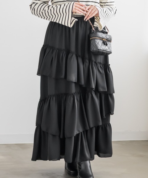 ◆商品ポイント◆ 【design】 アシンメトリーなラッフルデザインがフェミニンなロングスカート。動くたび揺れるような軽やかなデザインで今っぽい着こなしに。 【material】 表地は柔らかく落ち感のあるジョーゼット生地、裏地にはさらりとした伸縮性のない生地を使用。オールシーズン着用可能な素材感。 ◆model:161cm/普段3L着用 着用コメント◆ 3Lを着てちょうどいいサイズでした。ウエストは全部ゴムになっていて着心地らくちんで、アシンメトリーに重ねた生地の揺れ感が華やかさを演出するティアードスカートです!しっかり落ち感があるのでシルエットも広がりすぎずお洒落な雰囲気です◎フェミニン・ガーリー系のトップスとのコーデはもちろん、ジャケットやシャツと合わせてフレッピー系にもピッタリです♪あえてTシャツやスニーカーを合わせたカジュアルな着こなしもおすすめです! ◆サイズ(LL/3L/4L)◆ 着丈 92/93/94 ウエスト 77~128/83~134/91~142 ヒップ(裏地) 120/126/132 裾幅(裏地) 70/73/77 裏地着丈 71/72/73 ◆生地について◆ 裏地有り 透け感少し有り 伸縮性無し ◆洗濯表示◆ 液温は、30°Cを限度とし、洗濯機で弱い洗濯処理ができる。 漂白処理はできない。 洗濯処理後のタンブル乾燥処理はできない。 日陰でのつり干し乾燥がよい。 底面温度120°Cを限度としてアイロン仕上げ処理ができる。 石油系溶剤(蒸留温度150°C~210°C、引火点38°C~70°C)又はデカメチルペンタシクロシロキサン(沸点210°C,引火点77°C)でのドライクリーニング処理ができる(弱い処理)。 ◇◇◇ CLETTEについて ◇◇◇ ぽっちゃり体型、大きいサイズの方が『この服でいいや』ではなく『この服が可愛い』『この服を着たい』と思ってもらえるようなアイテムをお届けしています。 CLETTEだけでしか購入できないオリジナル商品を是非一度手に取ってみてください◎