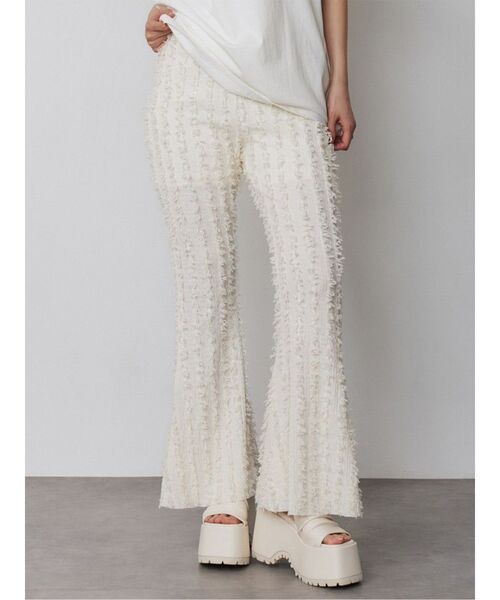 フリンジ素材のフレアパンツ 脚長効果のスタイルアップ効果抜群◎ ■アイテム トレンドのフリンジ素材が目を引くアイテム。 フレアシルエットで脚細、脚長効果でスタイルアップするパンツです。 ショート丈の裏地付きで通気性も確保されています。 ウエストゴムで履きやすく、ヒップから膝にかけてはぴったりめですが、 ショート丈の裏地付きなので透ける心配はありません。 伸縮性のあるフリンジ素材を使用しているので、履き心地も抜群です。 ヒップ周りが気になる方には、オーバーサイズのTシャツやキャミチュニック合わせがおすすめです。 -------------------------------------------- 生地の厚さ:普通 伸縮性:あり 裏地:あり サイズ感:ややタイト -------------------------------------------- 【知って得する便利機能◎ 】 ■商品のお気に入り登録 再入荷時、ラスト1点の時にお知らせします。 ■ブランドのお気に入り登録 新商品やお得な情報など、いち早くお得な情報をゲット! ぜひご活用ください! ※着用画像はフラッシュの加減で実際の製品と色味等が異なる場合がございますので、生地のズームアップ画像をご確認ください。 ※ご利用の端末画面の設定により実際の商品と色味が異なる場合がございます。