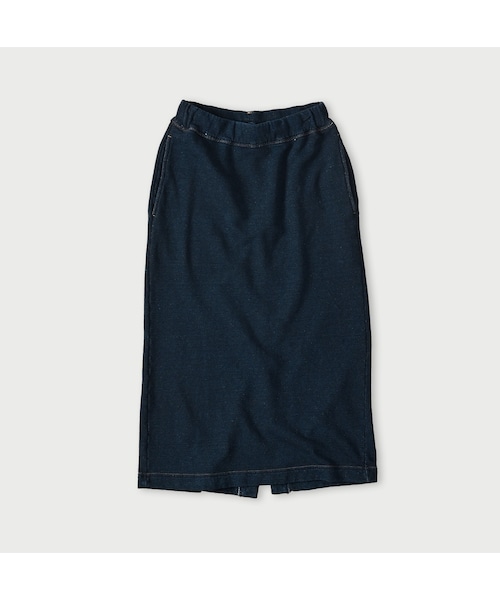 ざっくりふっくら3種の太さの違う糸を紡いで鮮やかなインディゴで染めてから裏毛よりもさらに甘く、柔らかく編み立てました。ざっくりドライタッチな肌あたりを残した軽やかでふかふかのガーゼ裏毛です。斜め付けしたセンターバックのベルトループパッチポケットのR刺繍に布パッチデニムのディテールを落とし込んだ穿きやすいスカートです。