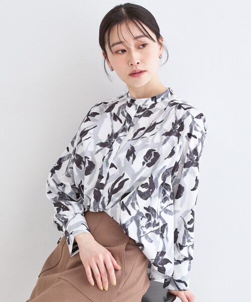 華やかなアート柄をプリントしたブラウス【デザイン】・華やかなアート柄をプリントしたブラウス。・肩ヨークをやや前に振り、ギャザーを入れて立体感のあるシルエットを演出しております。・袖口にも程よいボリューム感を持たせ、シンプルながら気映えする一枚に。・ボタンは比翼仕様、一番上のボタンのみアクセントにしております。【素材】・華やかなアート柄をプリントした、ポリエステルのブラウス素材を使用。・マシンウォッシャブルでお手入れも簡単です。※照明の関係により、実際よりも色味が違って見える場合があります。また、パソコン・スマートフォンなどの環境により、若干製品と画像のカラーが異なる場合もございます。モデル情報:身長170cm B76 W58 H86 着用サイズ:38(M)店舗へのお問い合わせ商品番号:637-85068●製品寸法:38(M):着丈58cm B104cm 袖丈57cm 肩幅41cm40(L):着丈59cm B108cm 袖丈58cm 肩幅41cm42(LL):着丈61cm B112cm 袖丈59cm 肩幅42cm備考: