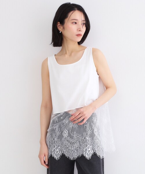 インナーに着るだけで簡単に華やぎをプラスできる!裾がレースで切り替えられた、レイヤード用のインナータンクトップ【デザイン】・裾にレースがドッキングされている、重ね着用のタンクトップ。・スカラップ使いがポイントの繊細なレースを使用しており、一枚プラスするだけで華やかに。・ヒップまで隠れるやや長めの丈感で、さりげなく体型カバー。・衿ぐりはすっきりと広めに開いているので、上から重ねたトップスのネックからはみ出ないようになっています。・ニットをはじめとした様々なアイテムと合わせていただけるインナーです。【素材】・ボディは、コットン/ポリエステル素材を使用。・レースはナイロン素材を使用しています。・マシンウォッシャブルでお手入れも簡単です。※照明の関係により、実際よりも色味が違って見える場合があります。また、パソコン・スマートフォンなどの環境により、若干製品と画像のカラーが異なる場合もございます。モデル情報:身長165cm B77 W57 H85 着用サイズ:38(M)店舗へのお問い合わせ商品番号:637-15336●製品寸法:38(M):総丈69cm B90cm 肩幅33cm40(L):総丈70cm B93cm 肩幅33cm42(LL):総丈71cm B96cm 肩幅33cm備考: