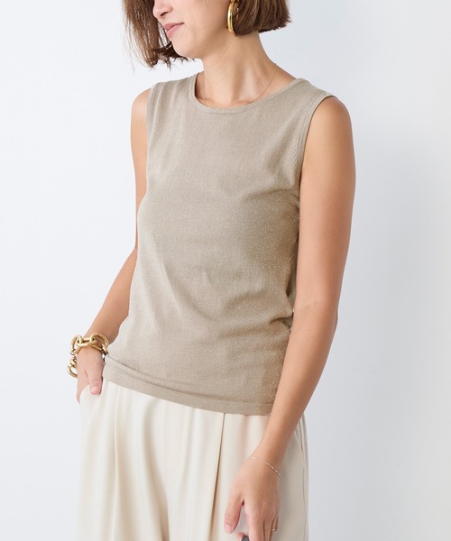 華やかな印象のラメタンクトップ。 コンパクトなサイズ感で仕様にもこだわり、上品なカジュアル感に仕上げました。 シンプルなノースリーブのデザインでレイヤードスタイルにも邪魔にならず、スタイリングのポイントになるアイテムです。 【fabric】 表に超細番手のラメ糸、裏にコットン100%の強撚糸を使用。 肌側に強撚綿を使用することで、ラメのチクチク感を軽減。 さらりとした肌触りと快適な着心地を実現しています。 -------------------------------------- 透け感:OFF WHITEのみややあり 裏地:なし 伸縮性:あり 光沢感:あり 生地の厚さ:やや薄手 --------------------------------------水洗い可 *詳しくは商品の洗濯表示にてご確認をお願い致します。 【coordinate】 ラメのさりげない華やかさで春のコーディネートにアクセントを加えてくれるタンクトップ。 一枚でヘルシーに着こなしたり、インナーとしてレイヤードを楽しんだりするのがおすすめ。 ジャケットやシャツの間からラメが覗くことで、シンプルなコーディネートにさりげない存在感と華やかさをプラスできます。 カジュアルなデニムと合わせることで、ラメタンクトップのヘルシーな魅力が引き立ちます。 小物をプラスしてアクセントを加えると、バランスの良い着こなしになります。 きれいめパンツなどと合わせれば、オフィスにも着ていけるような大人で上品なきれいめコーデが叶います。 ※商品画像はできる限り実物の色に近づけるよう徹底しておりますが、お使いのデバイスのモニター設定、お部屋の照明等の閲覧環境により実際の色味と異なって見える場合がございます。 ※画像の商品はサンプルです。実際の商品と仕様、加工が若干異なる場合があります。予めご了承くださいませ。 ▼商品のお気に入り登録 お気に入りアイテムの値下げ・再入荷・在庫1点などの通知を受け取ることができます。 ▼ブランドのお気に入り登録 新商品や再入荷、クーポン配布などのお得な情報を受け取ることができます。